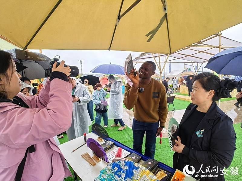 在宣州区风采展区,外国友人体验竹扇。人民网记者 汪瑞华摄